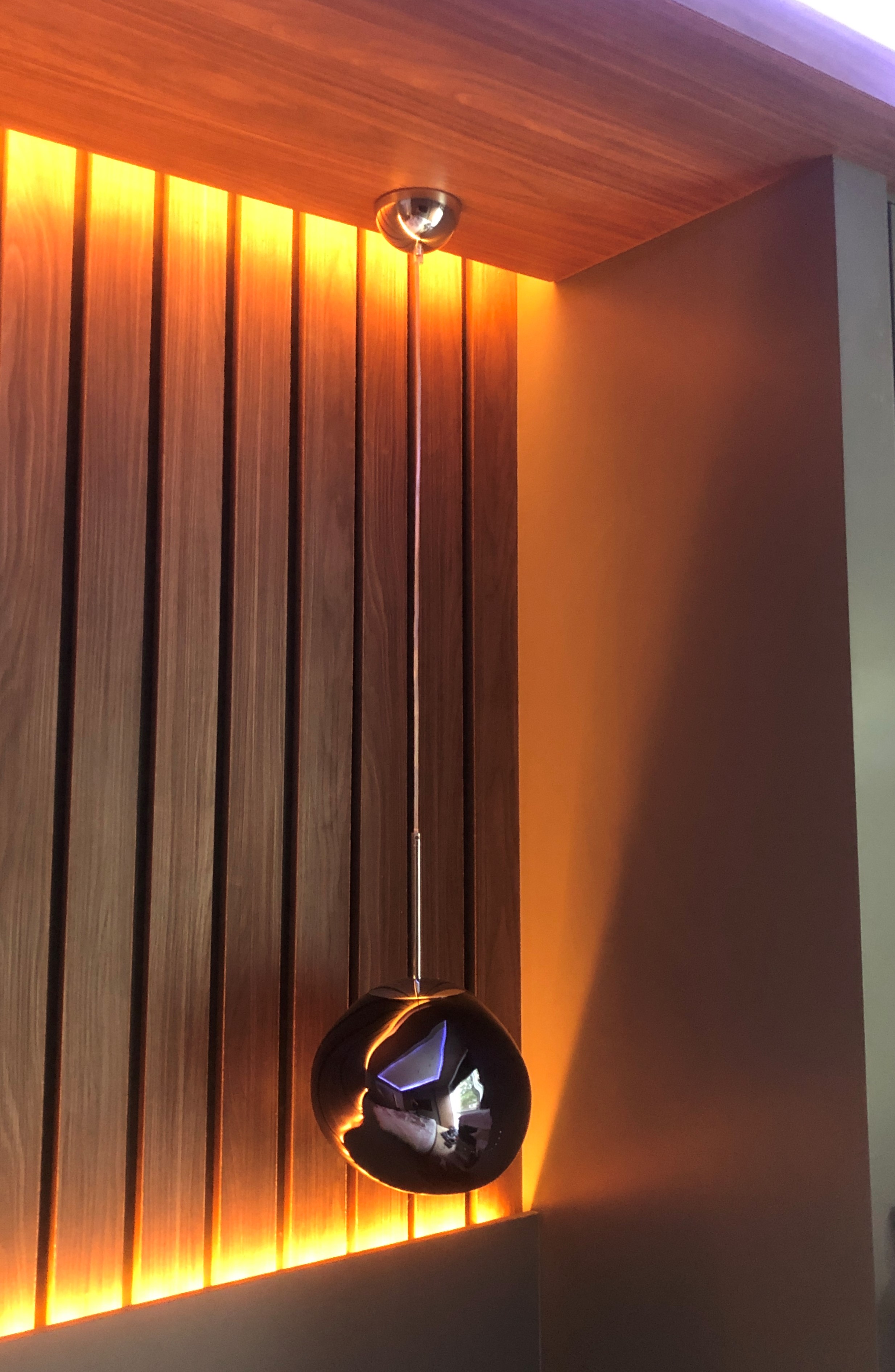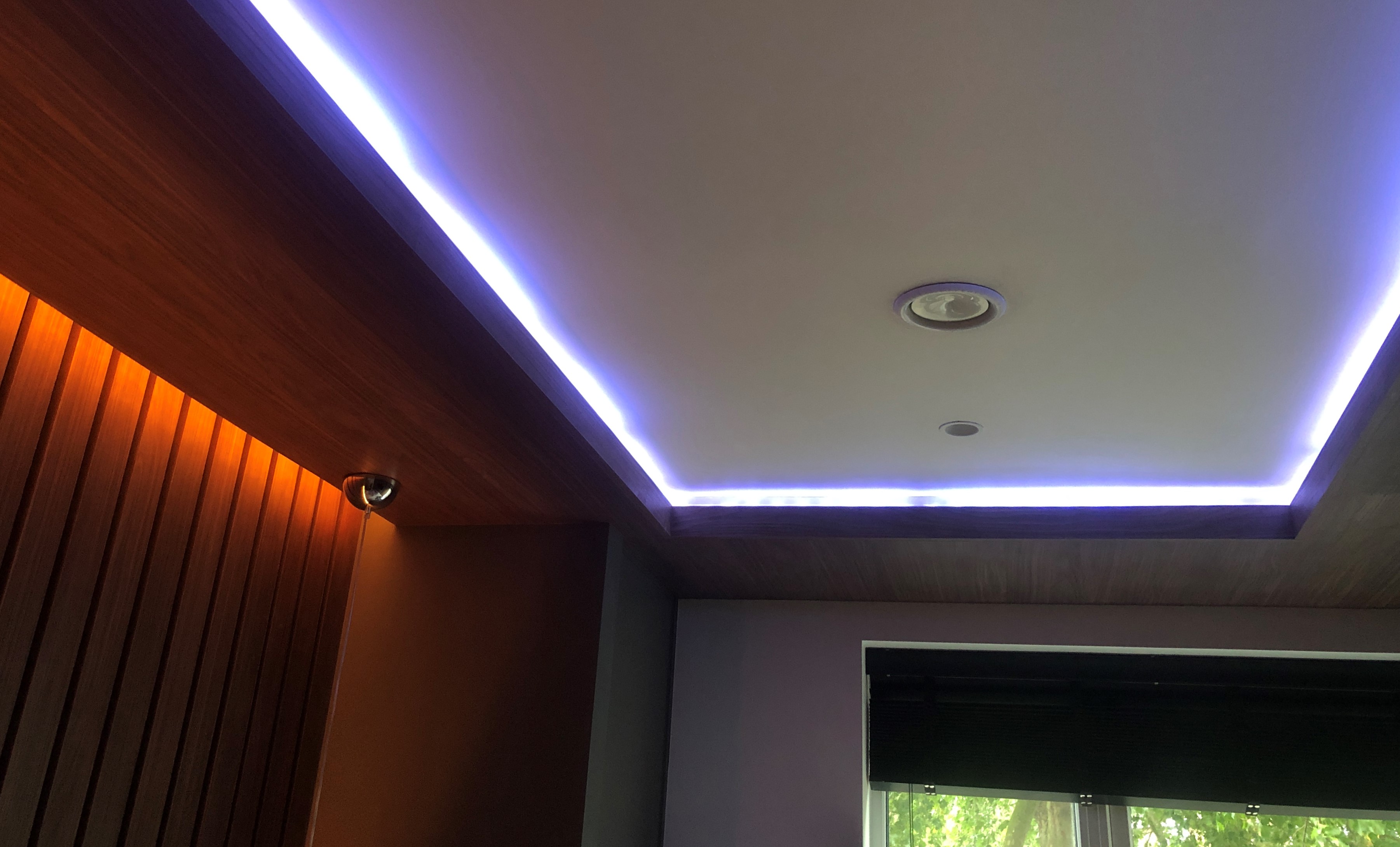 In this project the customer wanted a luxury hotel feel. I installed LED strip with RGBCCT colours. These strips can change colour and also produce the full range of white light. I soldered the strips and wired to a WIFI enabled device. He has programmed the strips to change colour throughout the day. Designer switches were also selected, these had to be specially mounted in the wooden paneling.