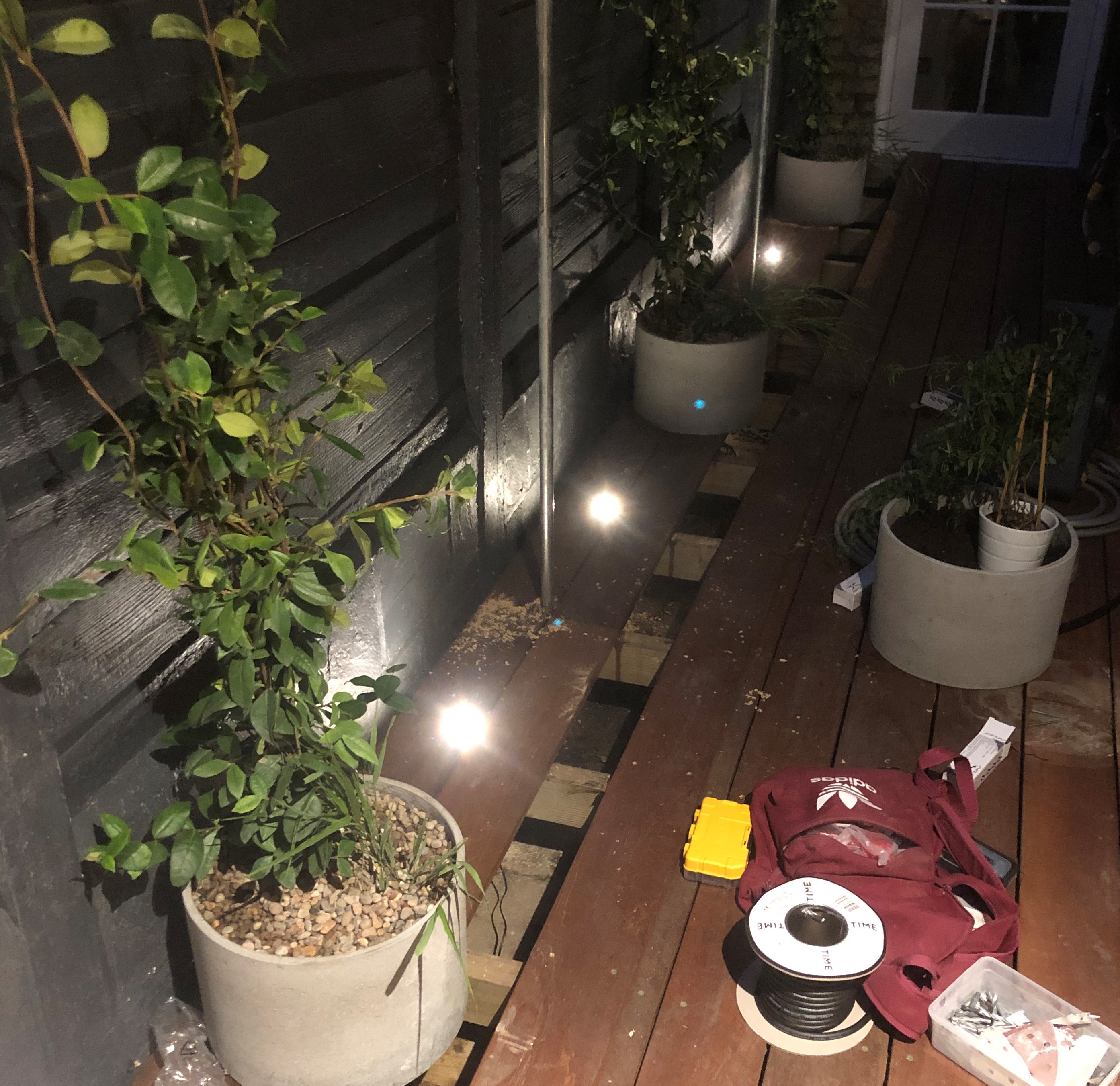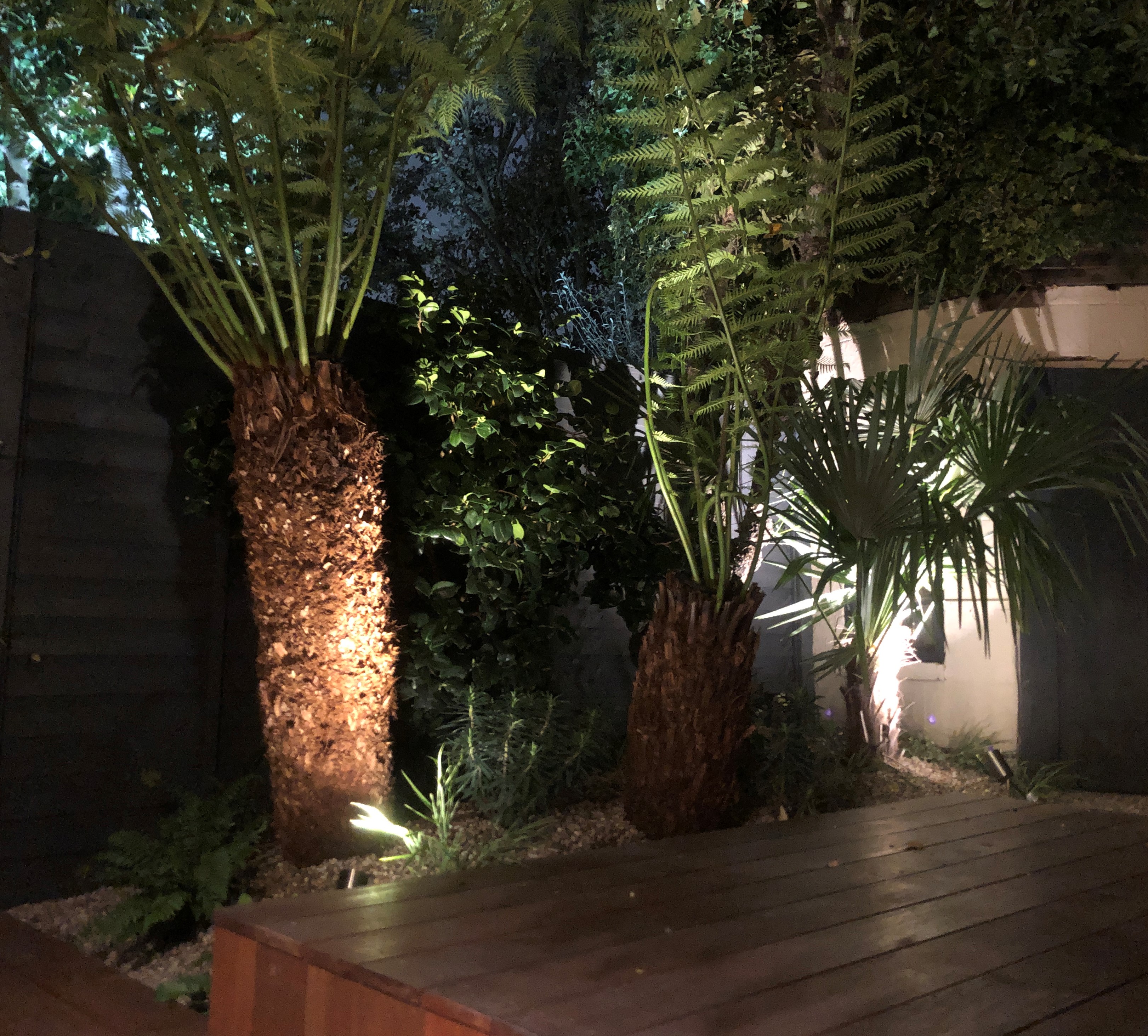 Very pleased with how this job turned out. I installed uplights around the ferns and deck lights by the side of the house. Quality materials and parts ensure watertight and durable.