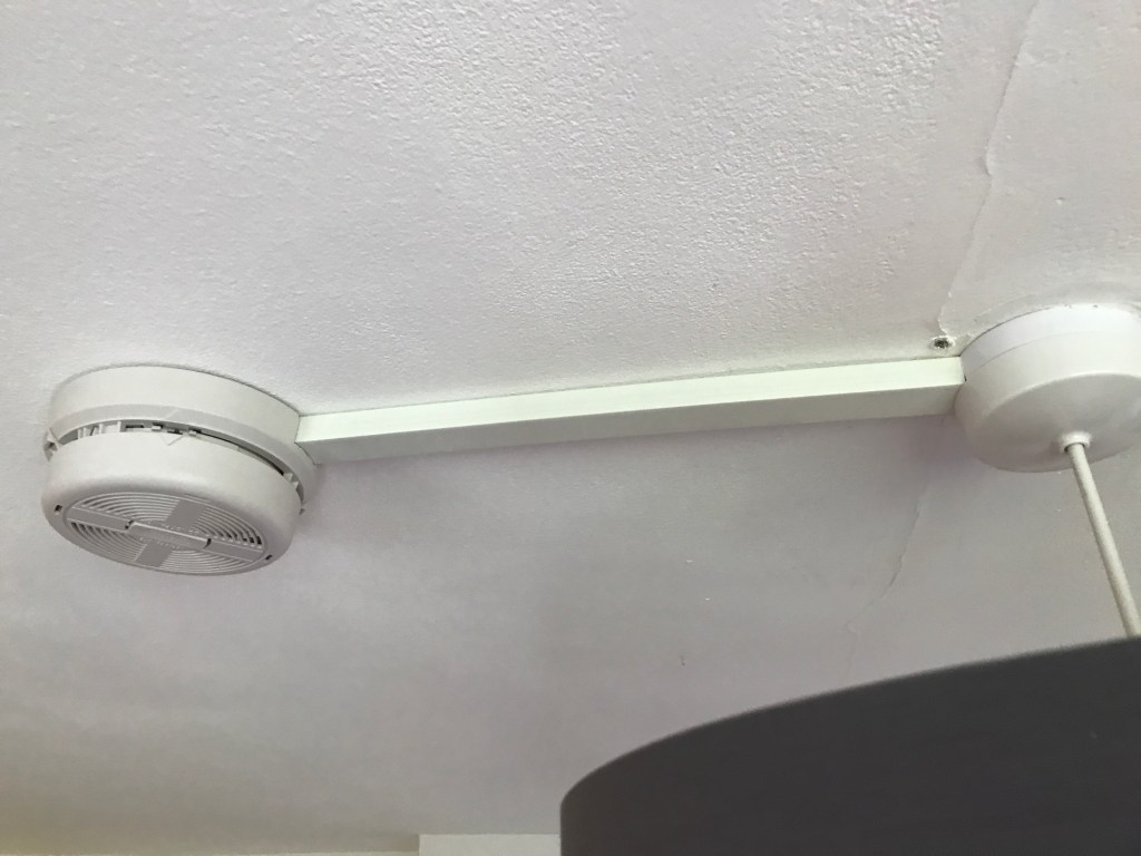 solution: To avoid running unnecessary wires, a feed was taken from the ceiling rose. Regulations require that the alarms be interlinked. This was achieved by using radio frequency base mounts.